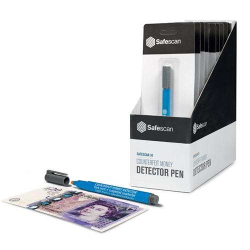 Ever seen a pen that can instantly check whether a banknote is real? The Safescan 30 is the ideal portable partner for checking counterfeit money. The eye-catching colourful detection pen is a perfect way for checking all currencies quickly and easily, on every location. If the created mark on the banknote changes colour, then you may conclude that the banknote is fake. If the mark fades and eventually disappears, then the banknote is genuine. The Safescan 30 can be used to test all banknotes and currencies.